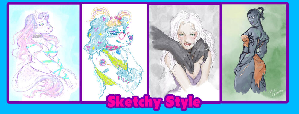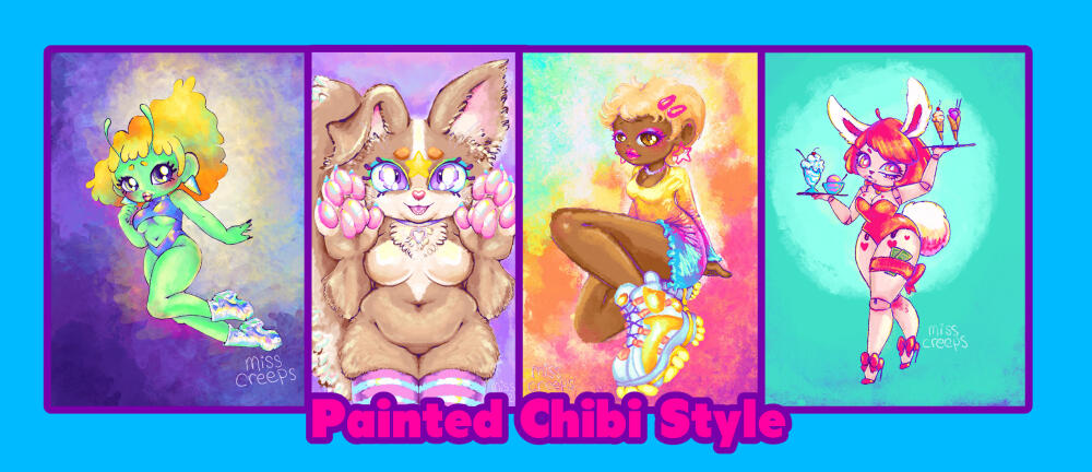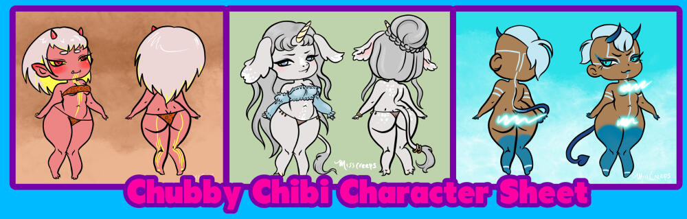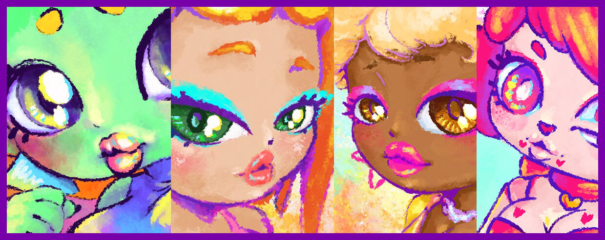Human or Anthro. Humans generally have pursed cute lips. Best for round, cute, and colorful characters! Simply, splotchy background in complimentary colors.